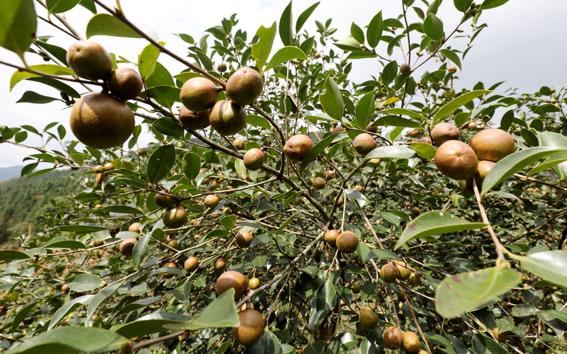10月21日,三江侗族自治县斗江镇思欧村宇塘油茶示范基地油茶树挂满果