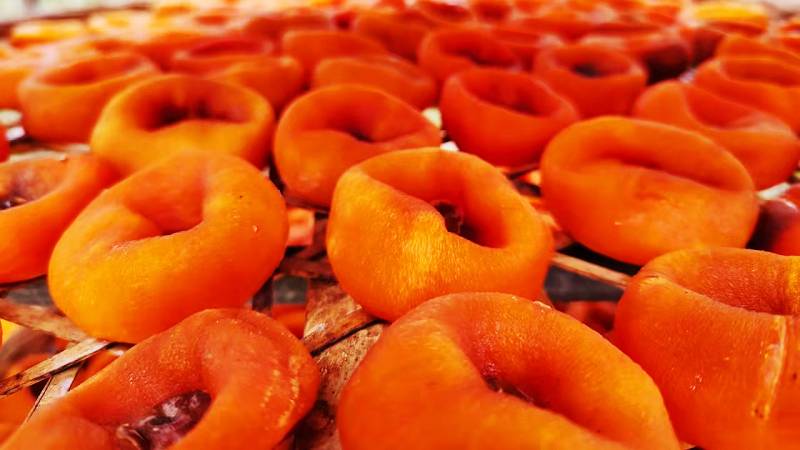 瑶族群众正在将晒场的柿子翻面,以便更好地风干。平乐县融媒体中心供图