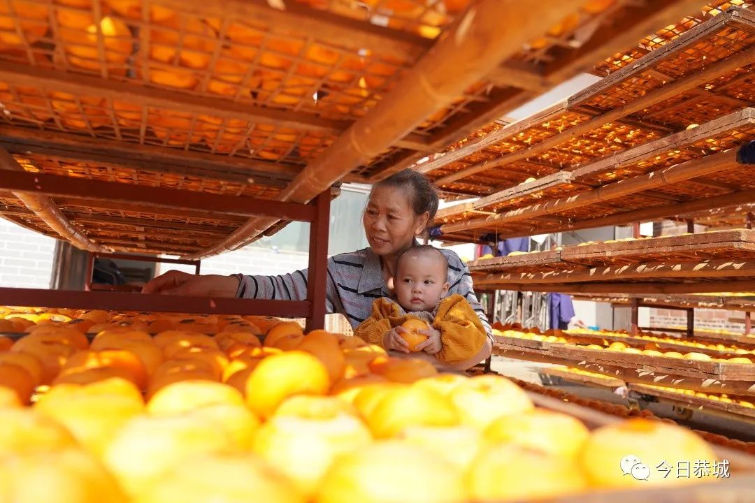 黄澄澄的柿子挂满枝头,有些熟透的柿子红彤彤,透过阳光,微微透亮,有蓝天白云映衬,更是一番美景。农家别院里,村民把柿子削皮,晒制柿饼,更是别样风光。