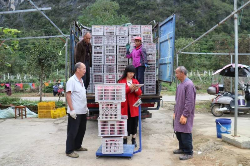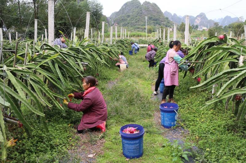 人民网阳朔12月7日电 初冬时节,在广西桂林市阳朔县白沙镇白沙村,该村的晟缘鑫火龙果专业合作社迎来了新一批火龙果的丰收,吸引了客商前来收购,火龙果产销持续火旺,成为了百姓眼中的“致富果“。