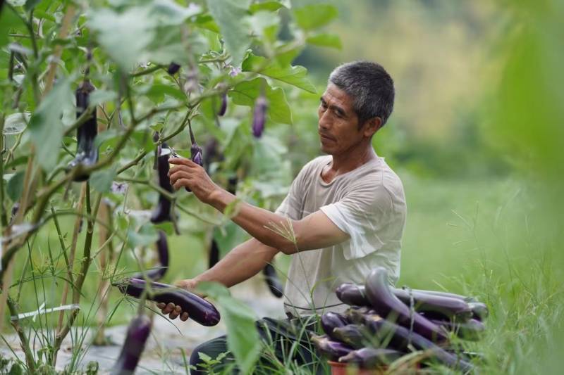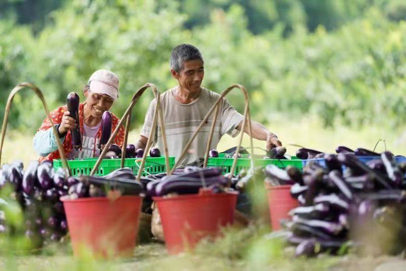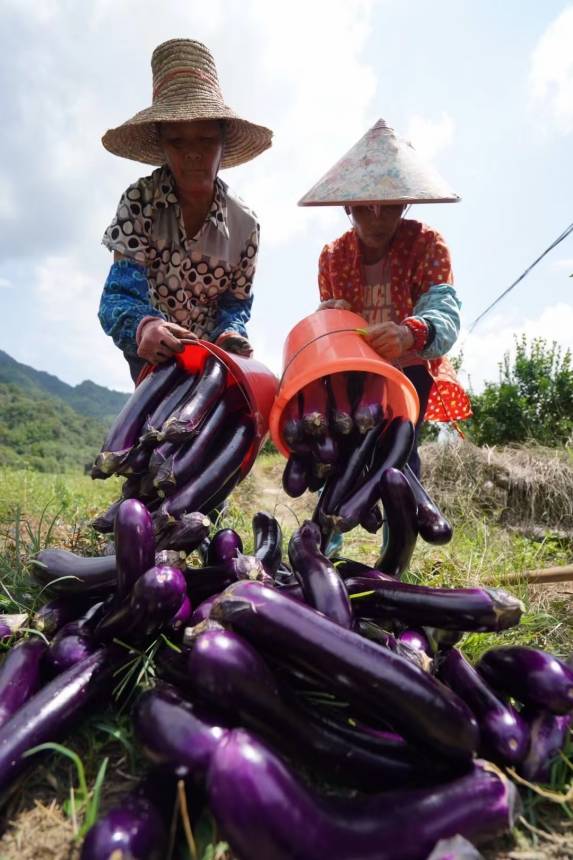 村民们正在将采收的茄子装筐。黄勇丹摄