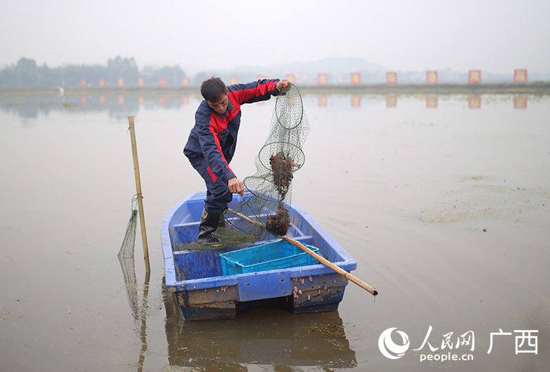 人民网桂平12月15日电 (沈泉池、吴明江)“吃小龙虾不用跑外边卖了,家门口就养有。“12月15日上午,广西贵港桂平市石咀镇旺龙村村民周石清一边在虾塘喂料一边说。去年7月,在外打工多年的她从广东回到家乡,在村口的小龙虾基地上班。“在家里上班能照顾老人小孩,收入也算下来和在外面差不多,非常方便。“周石清对家门口的这份工作十分满意。