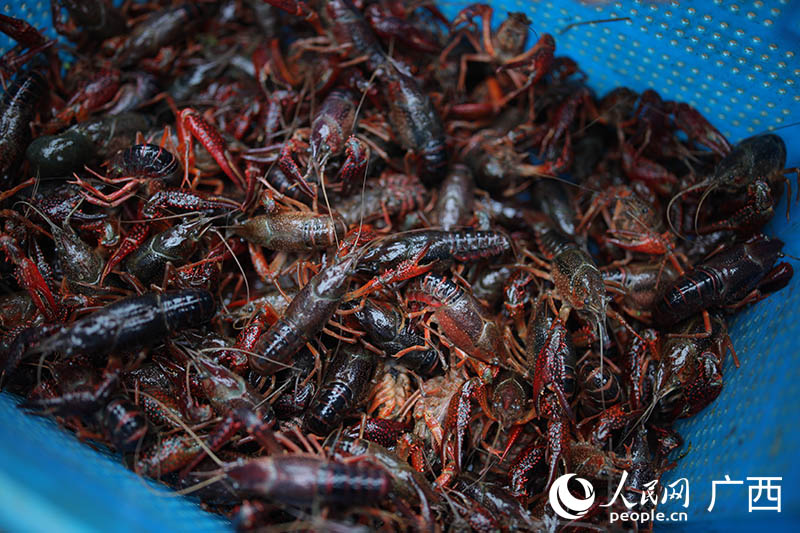 企业负责人在展示当地养殖的小龙虾。人民网 吴明江摄