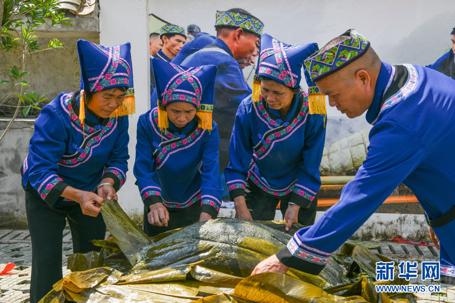 图为村民正在打开用龙写糯米制作的黑米大粽。龙写大糯以其质白、粒粗、软韧、香醇、口感极佳而闻名遐迩,畅销区内外。(黄少将 摄)图为德保壮族妇女展示隘章土布技艺。隘章土布保留了纯粹的手工纺织技艺,古朴的色调和纹样留存着淳朴的乡情风味。(黄少将 摄)图为身着民族服饰的壮家儿女挑满担稻谷走过田埂。...