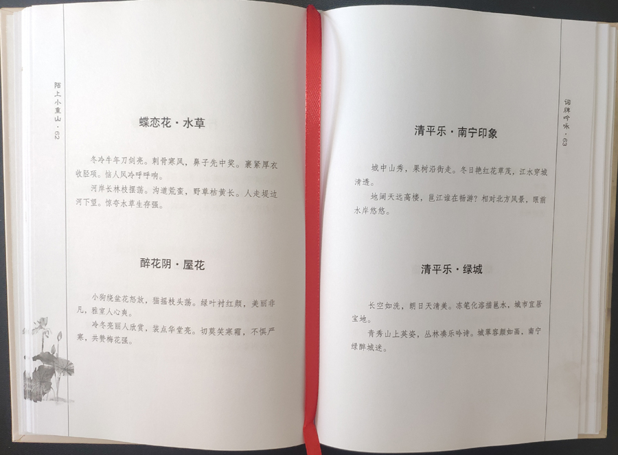 诗集分为词牌吟咏、韵律成行、古风和唱三辑。诗集里,作者根植于壮乡这片土地,用传统诗歌的表现方式,以平凡却又独特的新视角述说日常生活细微的冷暖知觉、爬涉的心路以及身边的一事一物,一草一木,乡村情怀尽收眼底,生动感人,富有诗意,又充满时代气息。