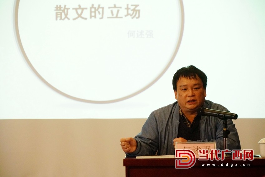 “只要我们有一双向历史回望的眼睛就能发现,散文是承载、记录我们中国思想文化的重要载体。千万不要忘记散文的这种使命。“何述强在进行《散文的立场》主题授课时说,散文创作的难度在于真实生活和经历有特殊的需求,不能简单的记录生活,需要不断地发现、思考、构建和提炼。针对如何写好一篇散文,找到散文的立意,何述强结合了《前赤壁赋》《不安之书》《湘行散记》《山河袈裟》等古今中外的名家名作对学员们进行了深入分析和解说,并以体物入微、随物赋形、超然物外的“三物论“,指导学员如何在现实生活中沙里淘金,将自已的经历、见闻以真实的支点进行文学性重构。