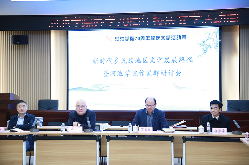 在中国作协第十次代表大会召开前夕,河池学院办学70周年庆典之际,12月4日,新时代多民族地区文学发展路径暨河池学院作家群研讨会在河池学院举行。本次研讨会作为河池学院70周年校庆文学周重要活动之一,由河池学院文学与传媒学院主办。班源泽、凡一平、田湘、区晓菲、费城、杨合、又见、卢俞州、覃展、宋先周、寒云、牛依河、桐雨、寒云、韦云海等河池学院知名校友作家及媒体记者等40多人参加了研讨会。河池学院副校长贺卫国致辞,文传学院院长欧阳珍、副院长陈代云、创意写作中心主任黄土路分别主持。