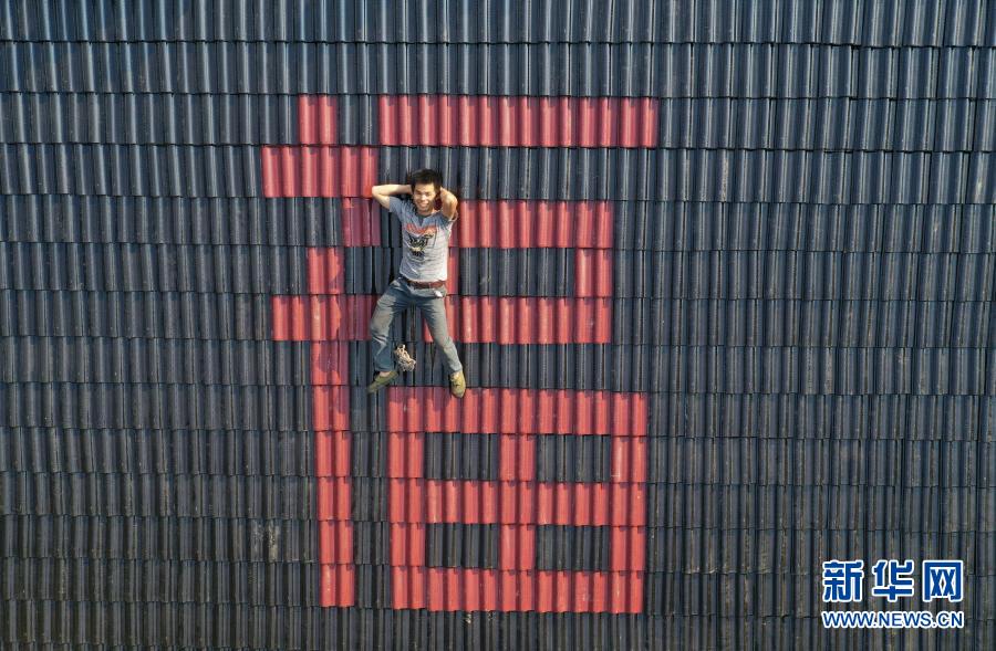在广西融水苗族自治县同练瑶族乡大坪村下大弄屯,脱贫户王道兵躺在即将完成危房改造的房顶(5月12日摄,无人机照片)。