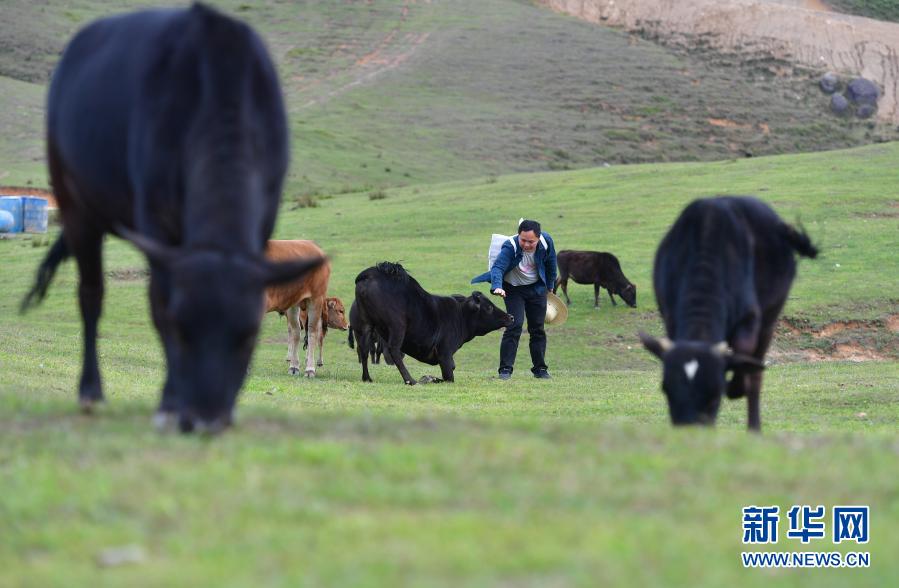 在广西融水苗族自治县杆洞乡尧告村高山天然牧场,驻村脱贫攻坚工作队员李义成在了解牛的生长情况(4月26日摄)。