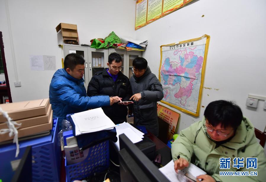 在广西融水苗族自治县杆洞乡花孖村村委办公室,驻村脱贫攻坚工作队员和村干部在工作(2019年12月1日摄)。
