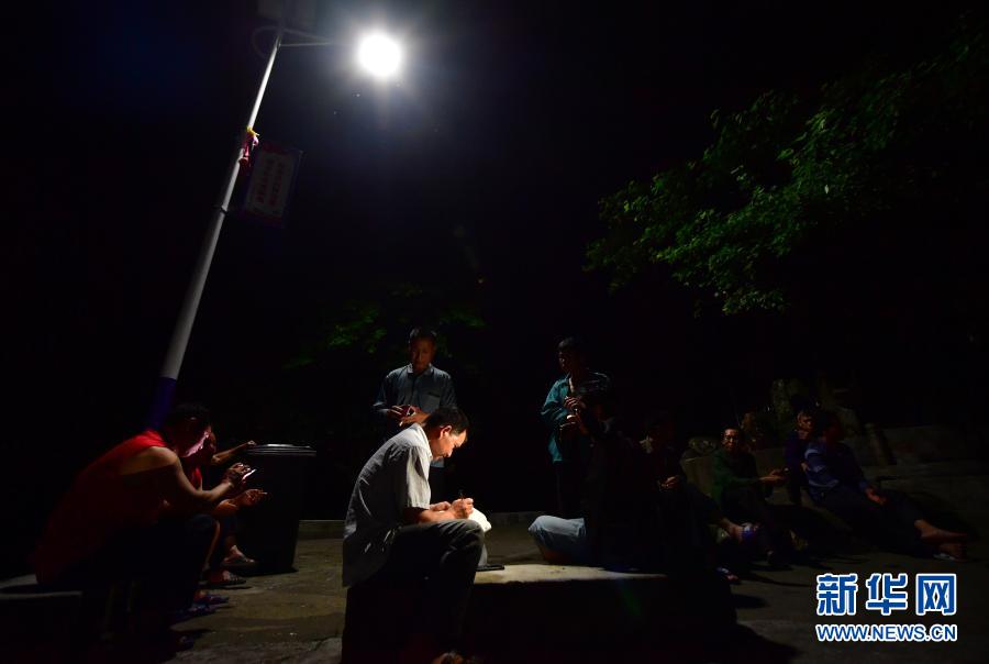 在广西融水苗族自治县杆洞乡党鸠村,村支书梁成张(前)在路灯下工作(5月13日摄,无人机照片)。