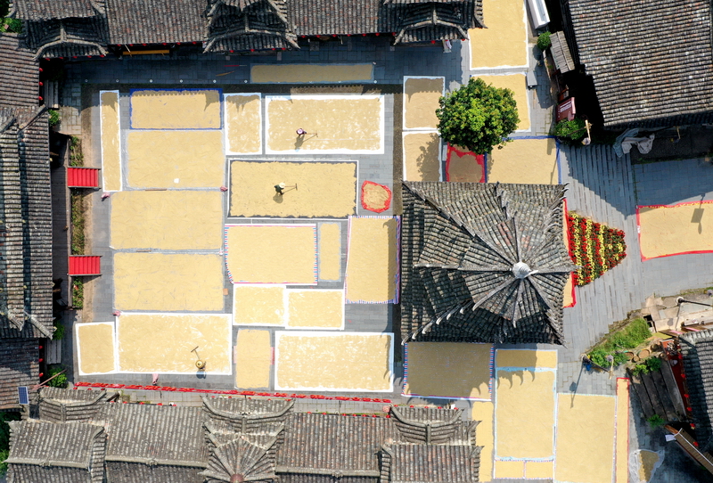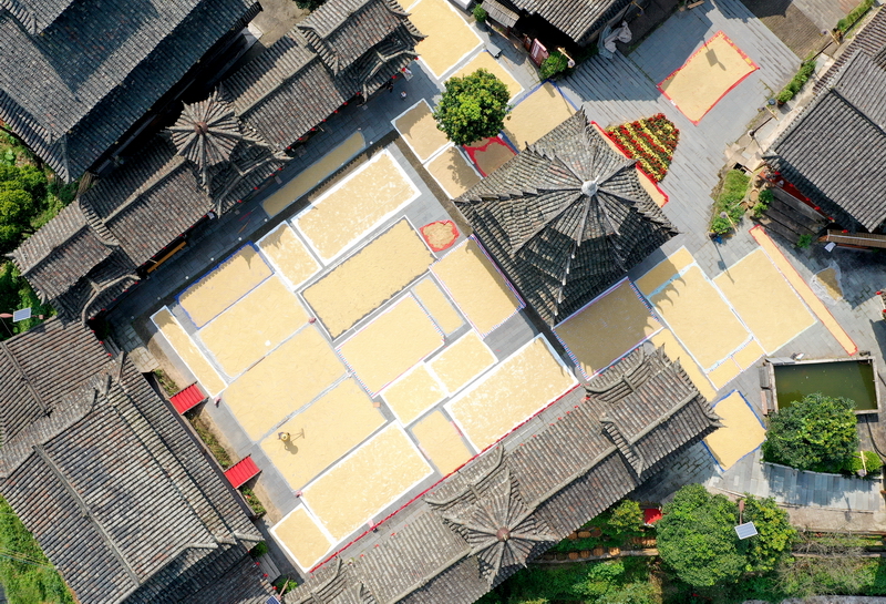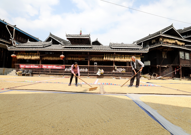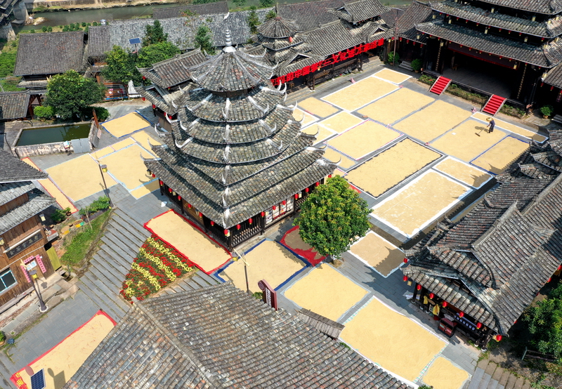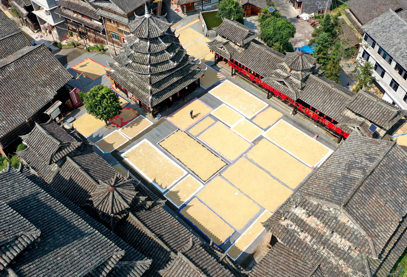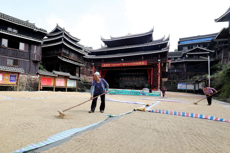 近日,三江侗族自治县迎来久雨晴天,当地农民抢抓有利天气忙着抢收、抢晒稻谷,古朴的侗族民居建筑群与晒秋场景相互掩映,勾勒出一幅金秋丰收图,美不胜收。