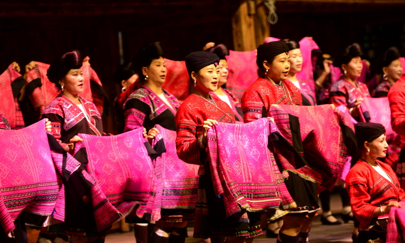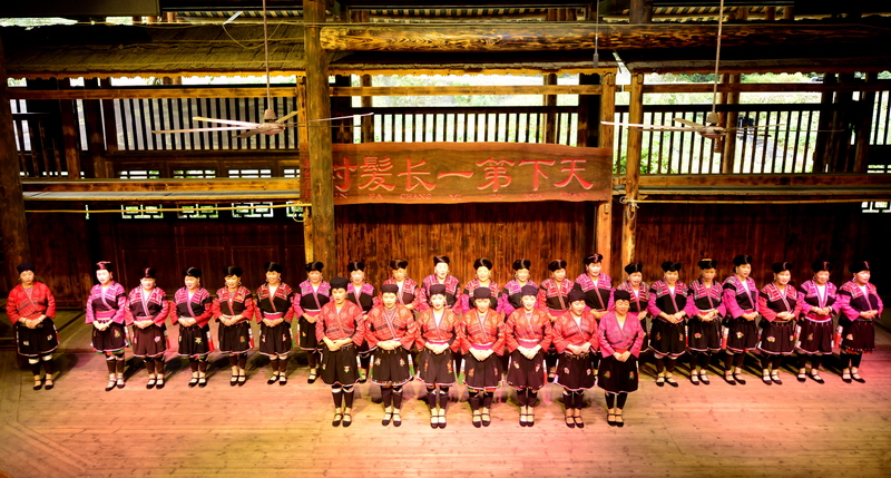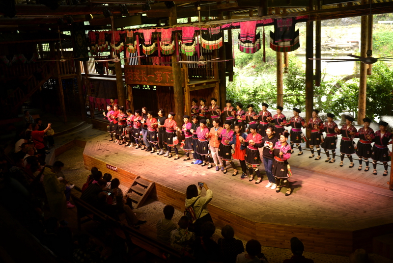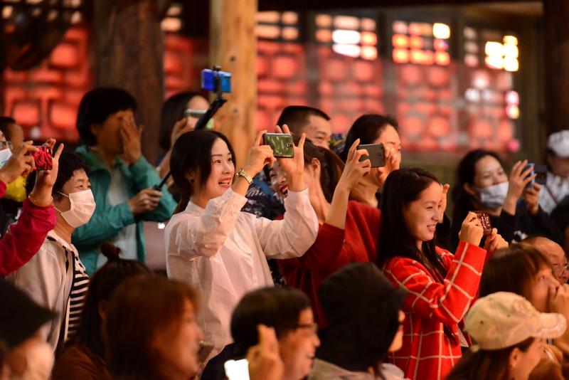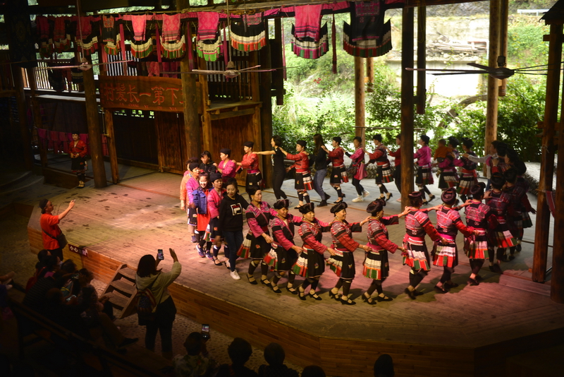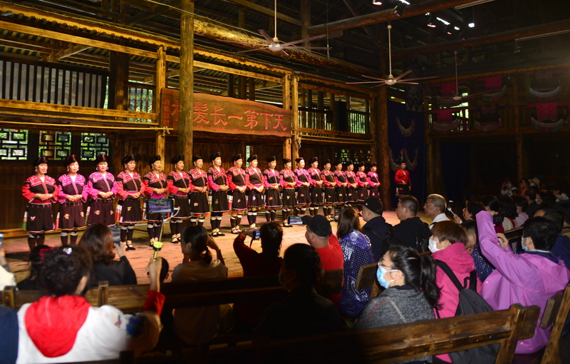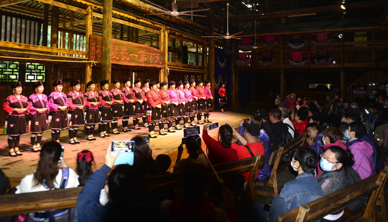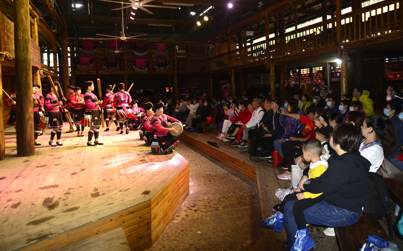 9月26日,在龙胜各族自治县龙脊镇黄洛瑶寨歌舞场,游客在观看民俗表演。 近日,龙胜各族自治县龙脊镇龙脊梯田景区迎来旅游旺季,赏梯田、品民俗、看长发歌舞表演的旅游路线深受广大游客青睐,每天吸引众多游客前来观赏体验。