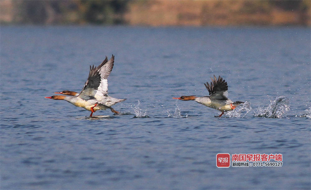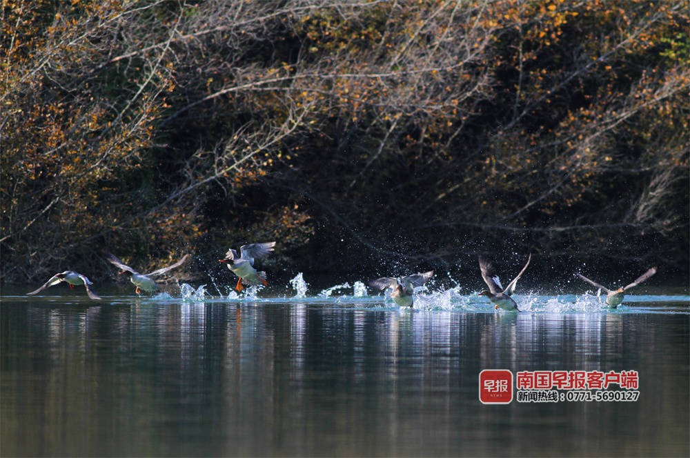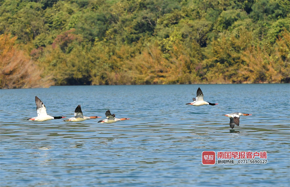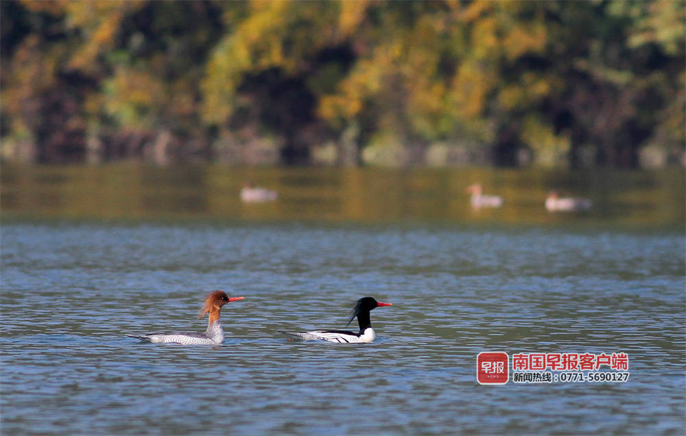 “几年前,每年零星发现一两只,开始叫不上名字,很难拍到,没有过多关注。去年成群来,我们查询发现是中华秋沙鸭。“百色市澄碧河水库管理中心何主任介绍,它们一般是头年的11月左右到来,次年的3月份左右离开,时间长达5个月。今年10月底到来的种群,数量明显增多,初步观测有数十只。