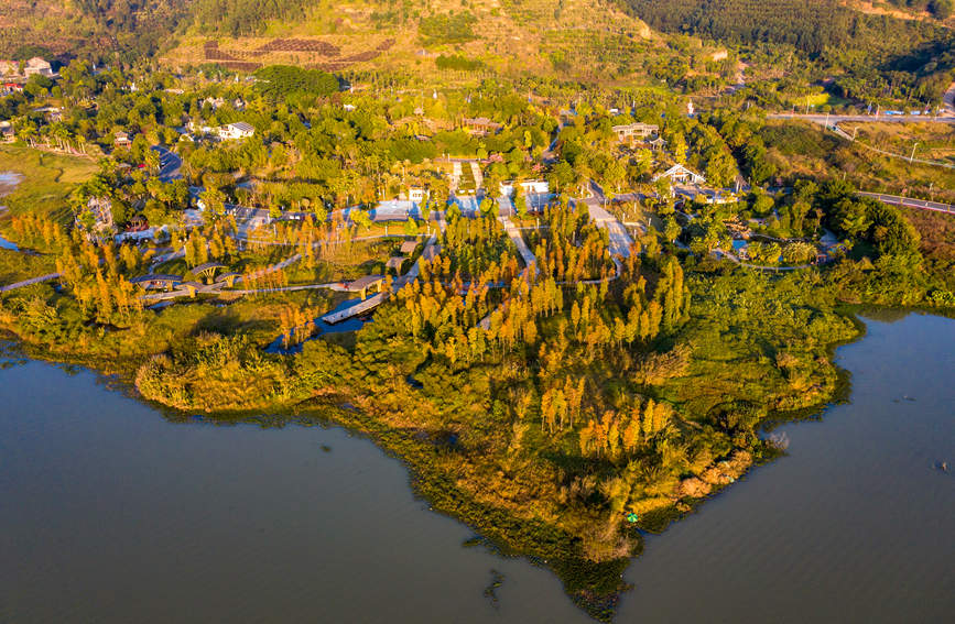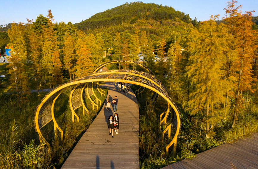 初冬时节,广西梧州市龙圩区苍海湖湿地公园内,层林尽染,五彩斑斓,景美如画,成为市民休闲娱乐的好去处。
