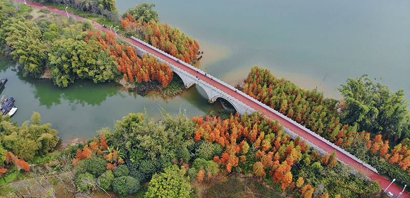 柳州市环江滨水大道黄冲屯附近的水杉穿上“红衣“。付华周摄