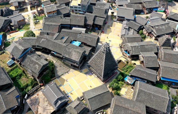立秋过后,柳州三江侗族自治县良口乡南寨村种植的优质稻收割已近尾声,村民们抢抓晴好天气,利用自家楼顶及屋边操场晒秋,金黄稻谷与特色侗寨交相辉映,满村尽是黄金屋一幅幅生动多彩的金秋丰收图呈现在眼前。 无人机航拍三江南寨村的晒秋美景。龚普康摄 无人机航拍三江南寨村的晒秋美景。龚...