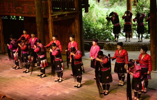 9月26日,在广西桂林市龙胜各族自治县龙脊镇黄洛瑶寨歌舞场,瑶族群众在表演长发梳妆 9月26日,在广西桂林市龙胜各族自治县龙脊镇黄洛瑶寨歌舞场,瑶族群众在表演长发梳妆 9月26日,在广...