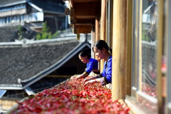 8月28日,在龙胜各族自治县伟江乡新寨村,村民将辣椒放在房前屋后进行晾晒。 今年,龙胜各族自治县伟江乡种植的400多亩辣椒喜获丰收,村民抢抓晴好天气,将收获的辣椒放到房前屋后进行晾晒,苗族到处呈现一幅幅美丽的晒秋图。(吴生斌 阳迪/摄)...