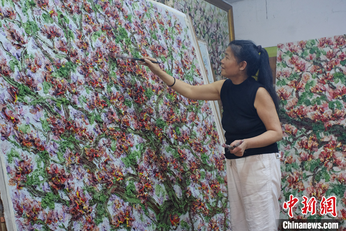 中新社柳州3月27日电 题:广西“洋紫荆”油画画家:中西绘画并非“隔着墙”作者 刘俊聪近期,广西柳州市近30万株洋紫荆竞相开放。该市的大街小巷被大片的洋紫荆包围,宛如一片“粉色海洋”。在画家林建莉的工作室内,她正站在椅子上,用画笔肆意描绘着一幅巨型的洋紫荆油画。图为3月22日,广西柳州,林建莉的工...