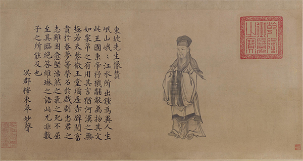 明代一位工书画的大臣朱之蕃也画过苏轼像,作品称作《临李公麟画苏轼像》,这件作品所依据的粉本传为苏轼友人李公麟所作,所以本件作品称“临“为临摹之意。