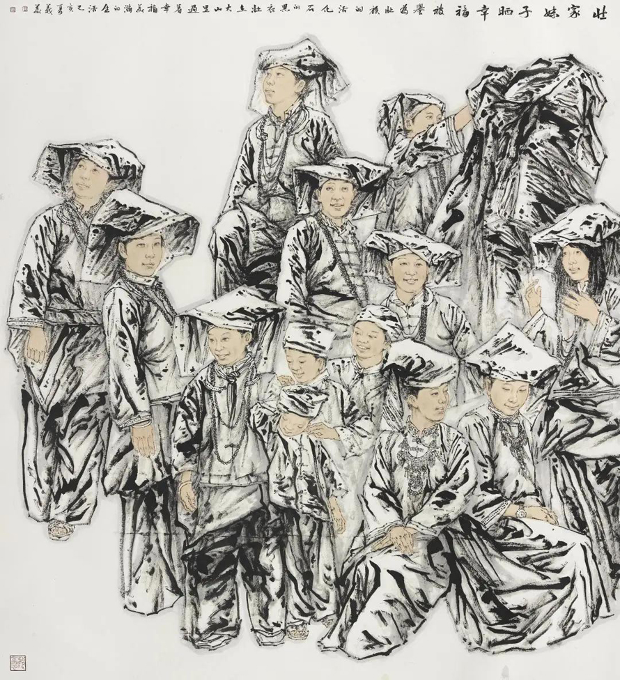 陶义美作为学院派的画家,从早年书法篆刻到后来的线描人物画再到近几年的山水画艺术创作。艺术家的个体发展既与地域发展结合,又需要个人大胆创新的自我蜕变,这在漓江画派艺术家中表现得尤为显著。陶义美主攻中国人物画创作,在人物画创作中他又选择了“线描“。线描,即称白描,是用毛笔、墨、宣纸、中国画颜料等材料,通过勾勒、设单色的方式表现客观物象的画种。看似简单,实则很难。一根线条蕴含着抑扬顿挫的节奏感与生命力,浓淡不一的墨色,增加了画面的层次感与丰富性。陶义美的线描人物画作品多表现的是广西的少数民族人物,尤其以苗族、壮族为代表。他经常到广西少数民族较为集中的德峨、南丹、融水等地采风、写生,与当地村民乡亲同吃同住,与他们聊天、畅饮,了解他们的生活方式,感受他们的民族情感与精神,收集与积累了大量的创作素材与资料。满脸皱纹、沧桑淳朴的老人,美丽大方、纯情温柔的姑娘,生龙活虎、血气方刚的小伙儿,还有天真无邪、稚幼可爱的小孩,这些少数民族人物形象跃然于纸上,生动传神。他们或歌舞、或劳作、或休息、或赶圩、或凝思……,把少数民族人民的勤劳、质朴以及他们原始、粗旷、民族的独特美通过线描艺术演绎的淋漓尽致。