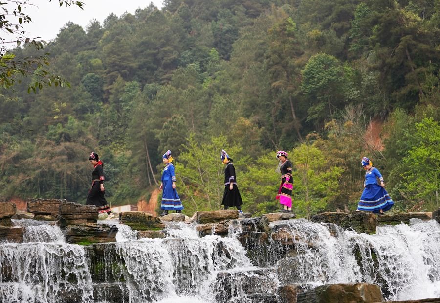 游客穿着民族服装在油菜地里赏花。黄少将 摄