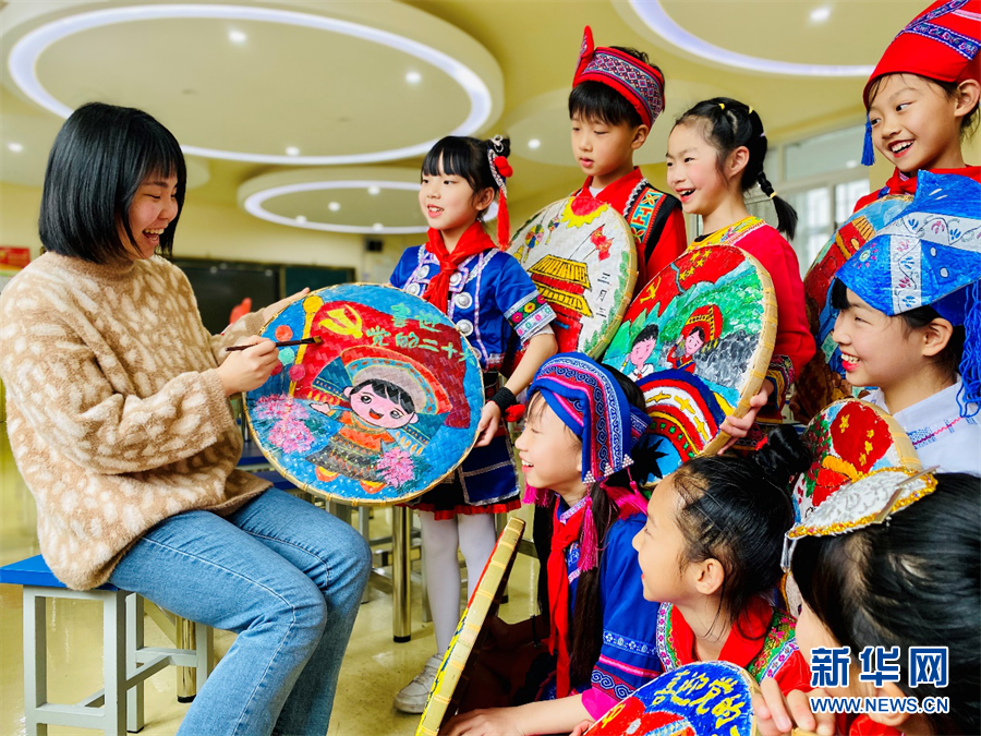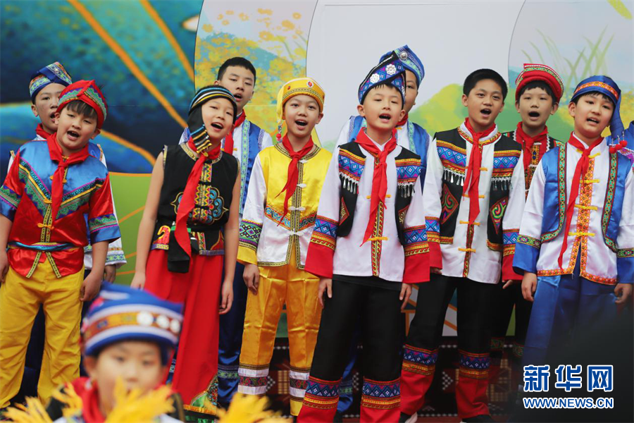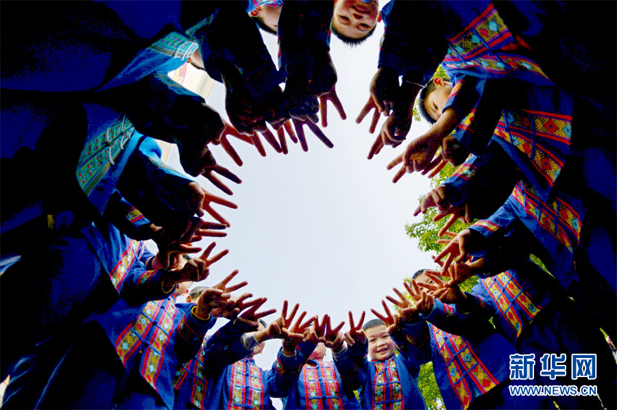 广西河池罗城仫佬族自治县第一小学仫佬族儿童古歌社团的学生们庆祝节日到来。新华网发