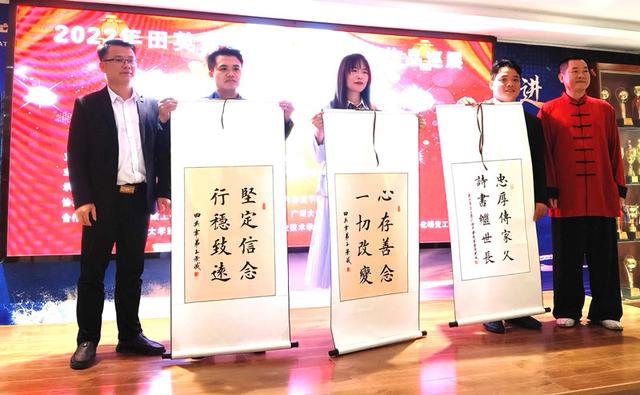 会上,活动赞助单位新领航地产德前分公司总经理蒋艳、俏皮羊南宁分公司经理刘国俊、美宜佳连锁店总经理覃庆来接受了活动组委会赠送陈景泼书法作品。