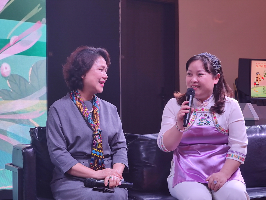 “山歌的未来在哪里?“广西著名壮族歌唱家黄春燕抛出天问式问题后,讲述她从“唱那坡山歌走出来的民族歌唱家“的故事,她的团队成员、青年教师温智淞、陈明珍也分享了各自在民歌传播与教育上的工作经验。
