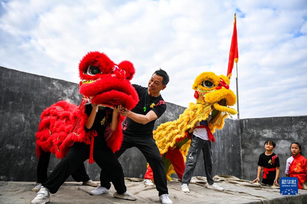 2月2日,在广西兴业县石南镇东周村,教练在传授舞狮的基本功。