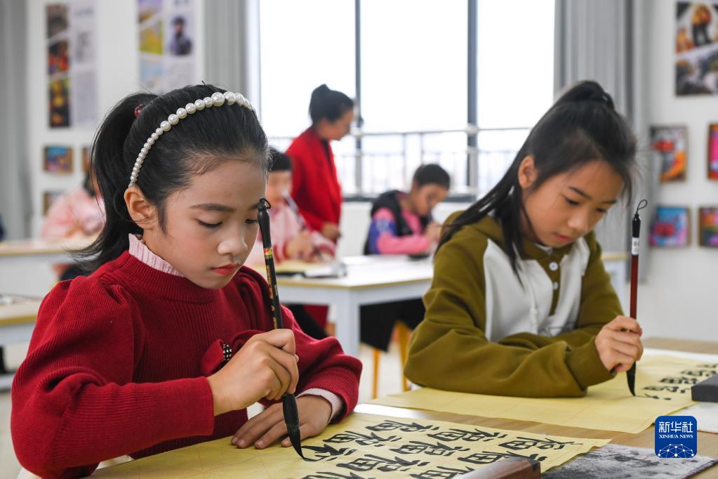 2月2日,在广西兴业县至德小学,学生们在练习书法。