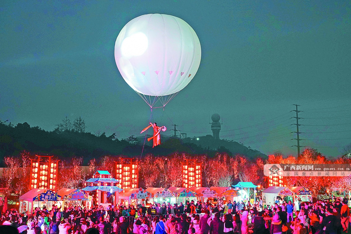 2月3日晚,不少市民在南宁市青秀山风景区观看实景演出。元宵节期间,该景区举办樱花灯会,运用声、光、影、水、雾、烟和全息影像技术,打造水幕灯光秀、花主题“夜樱之梦”、塔楼灯光秀等,吸引众多市民前来赏灯游玩。喻湘泉 摄