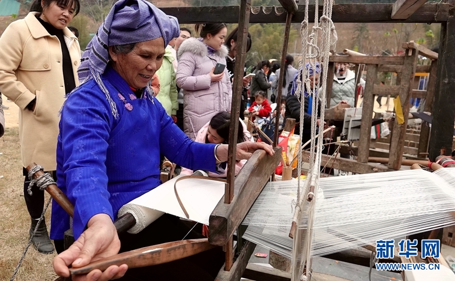 广西河池市东兰县巴畴乡巴英蚂拐(虫另)节民俗活动现场展示传统纺织技艺。高东风摄