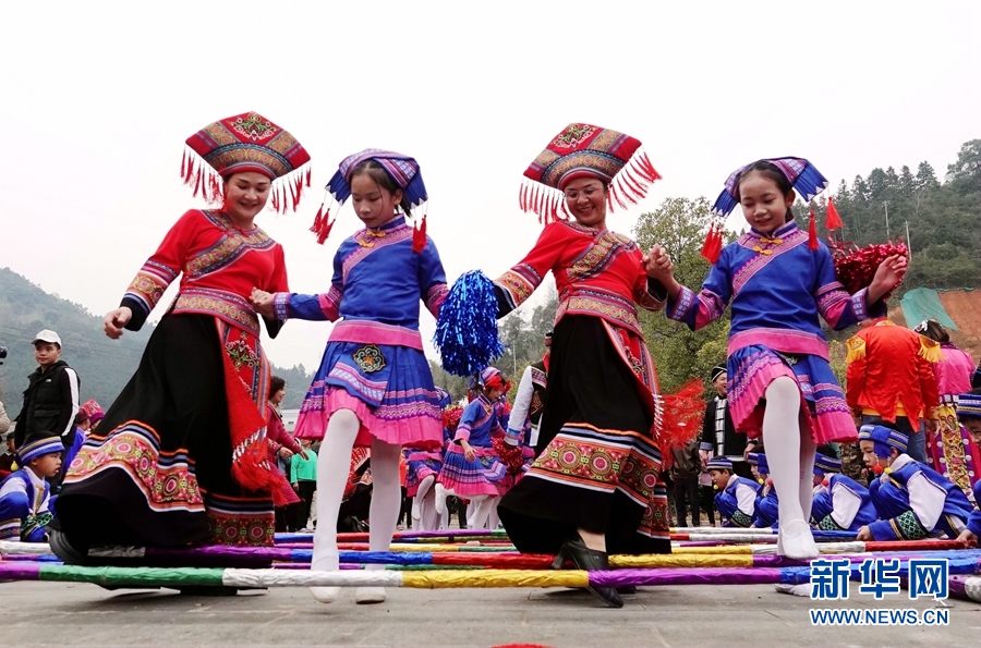 广西河池市东兰县巴畴乡巴英村群众和游客跳起欢快的竹竿舞。高东风摄