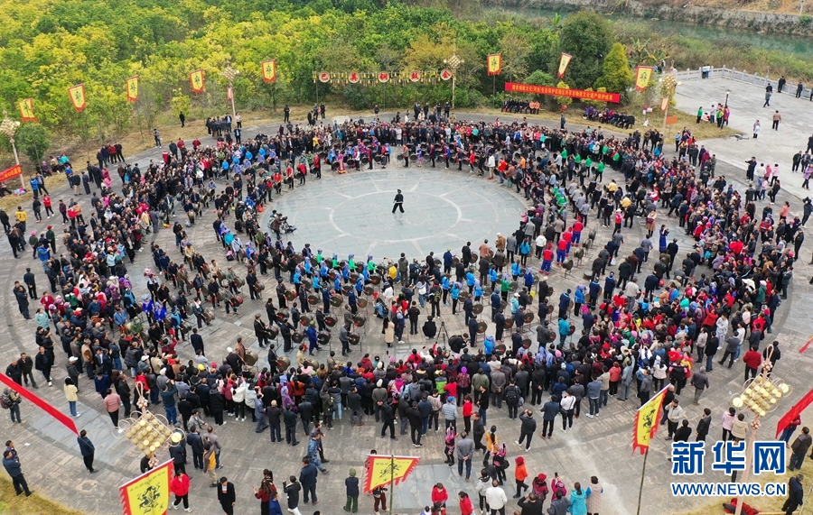 2月21日,俯瞰壮观的广西河池市东兰县巴畴乡巴英铜鼓会。高东风摄