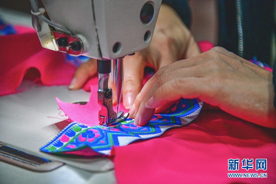近日,在广西忻城县壮锦生产基地里,工人们正在制作壮锦服饰。