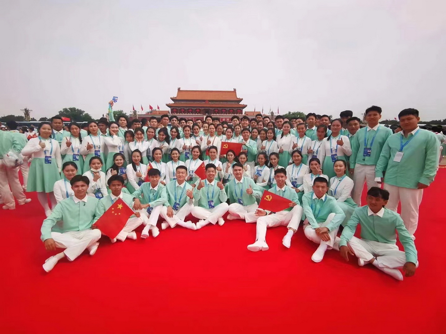 参加庆祝中国共产党成立100周年大会合唱方阵(第二排左六)