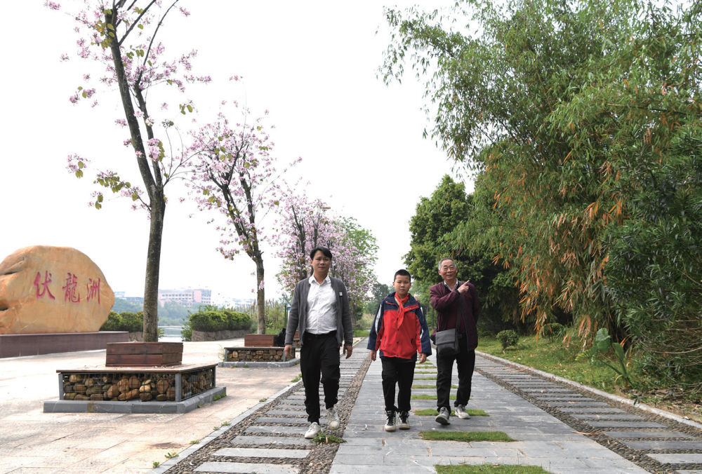 2022年4月10日,伏龙洲原居民黄岗(右)带着儿子、孙子重回改造后的伏龙洲游玩( 周华/摄 )