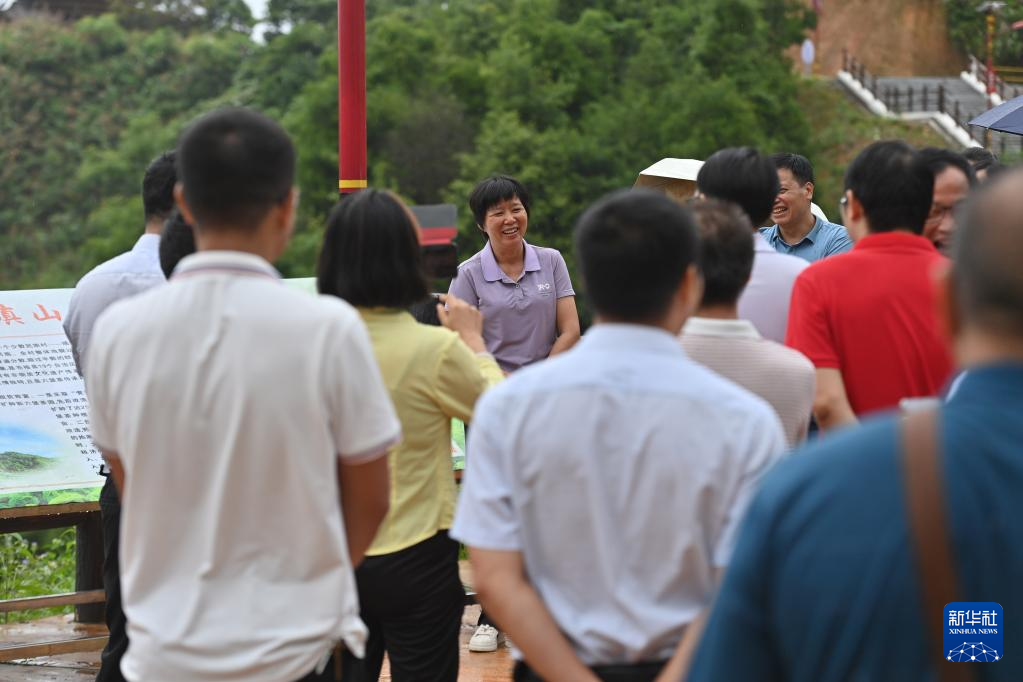6月7日,在苍梧县六堡镇山坪村,祝雪兰向来访者介绍六堡茶文化和茶产业发展情况。