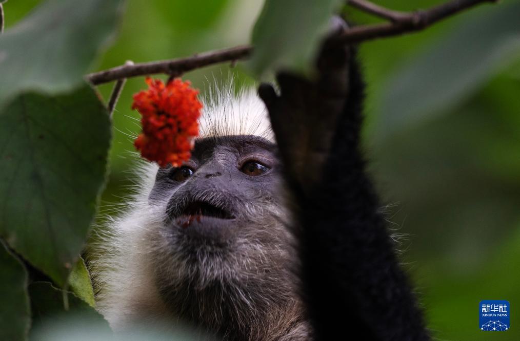 一只白头叶猴在食用鲜果(8月4日摄)。