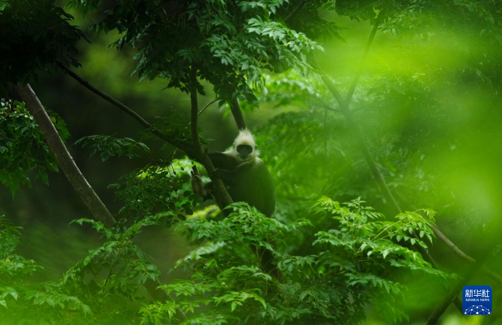 一只白头叶猴在树林中觅食(8月5日摄)。