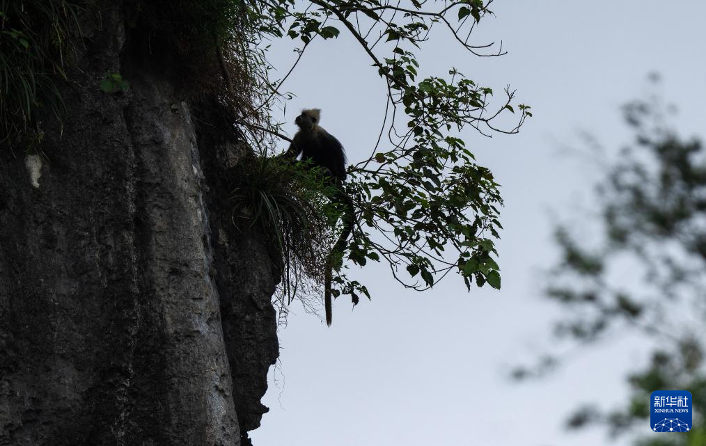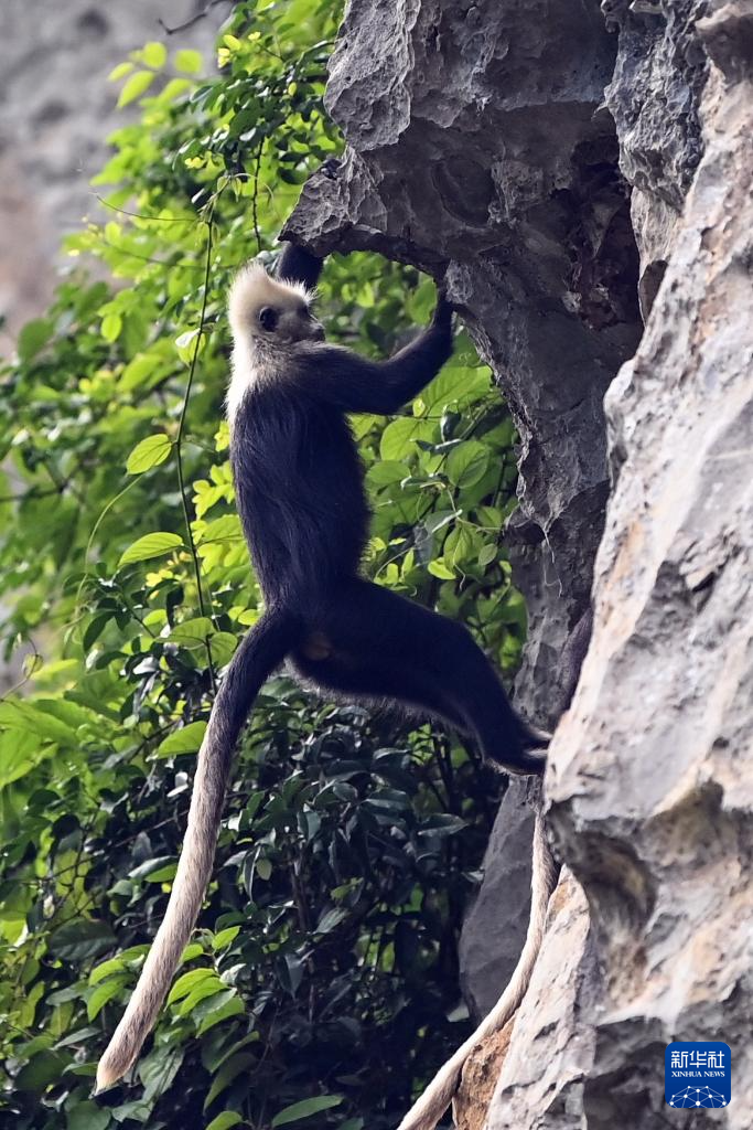一只白头叶猴在攀岩转场觅食(8月5日摄)。