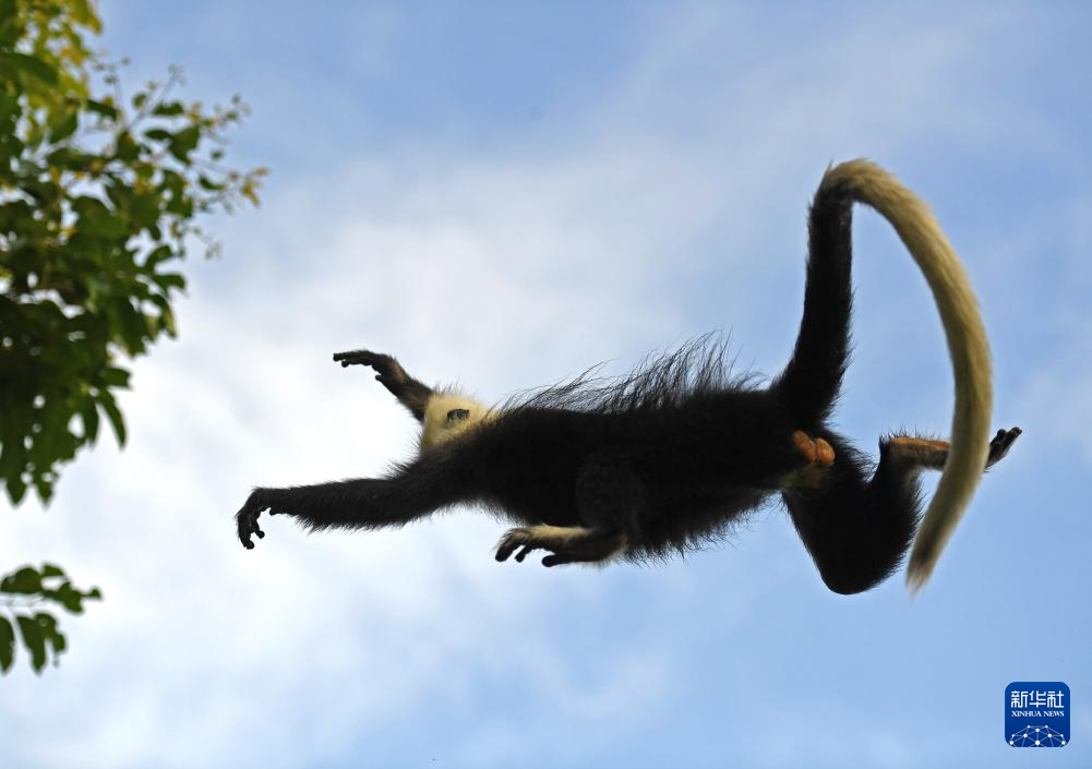 一只白头叶猴从悬崖上跃向树林(8月5日摄)。