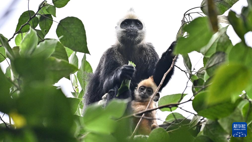 一只白头叶猴带着幼猴觅食(8月4日摄)。