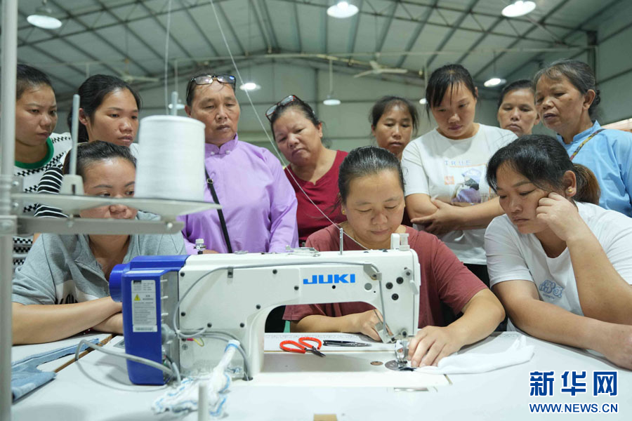 在融水洞头村洞头轻纺就业帮扶工厂,准备进厂务工的农家女观摩一位熟练工缝制衣服。