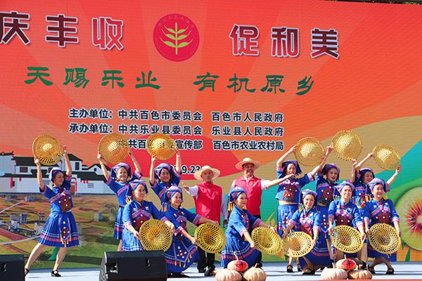 人民网乐业9月25日电 (沈泉池、实习生潘璐轶)9月23日上午,广西百色市乐业县甘田镇“奇幻农庄”广场群龙共舞、锣鼓喧天、热闹非凡,由百色市委、市政府主办,乐业县委、县政府和百色市委宣传部以及百色市农业农村局承办的2023年百色市庆祝中国农民丰收节主场活动在这里举行。