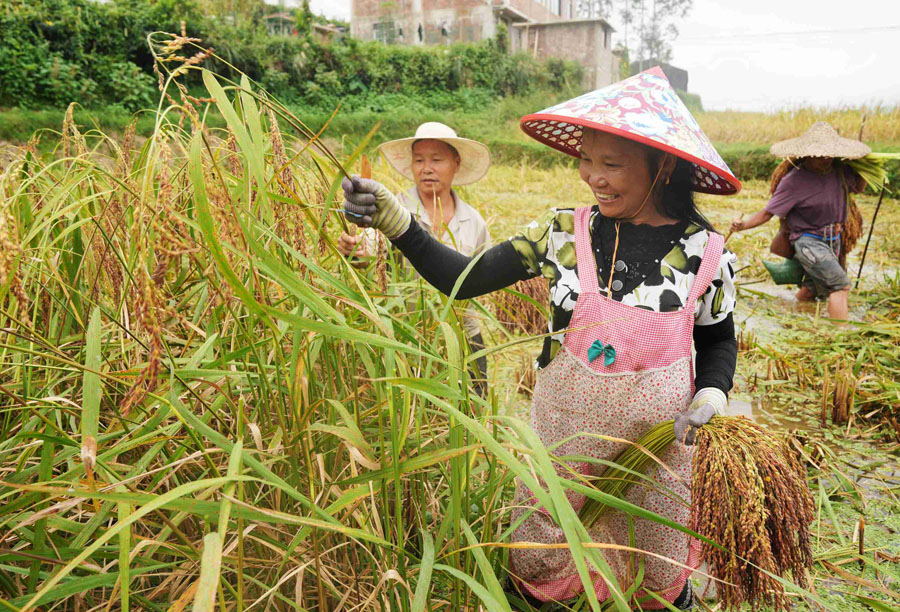 在广西柳州市融水苗族自治县红水乡,村民在田间剪禾。