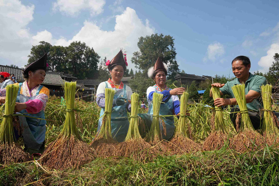 在广西柳州市融水苗族自治县红水乡,村民把刚剪下的糯稻扎成禾把。