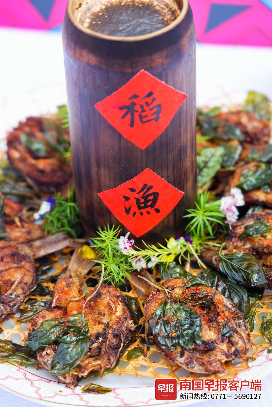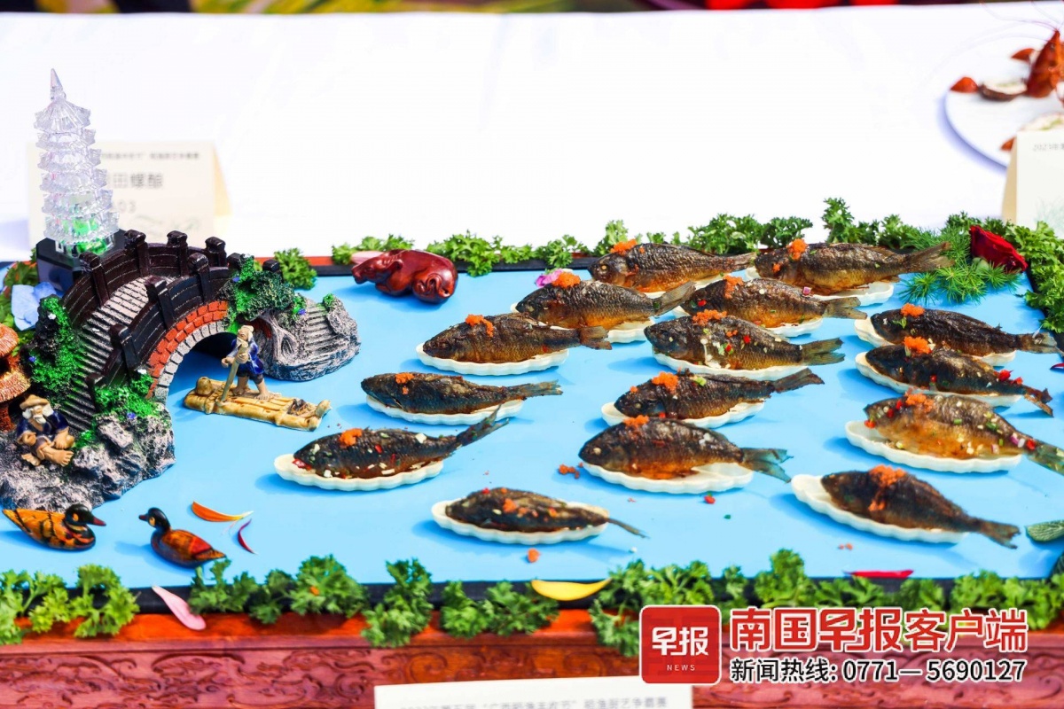 “螺味十足”“盐焗紫苏酿稻鱼田螺”“金汤稻田荷花鱼”“荔枝虾球”“捞汁龙虾”……一道道美味可口的稻渔佳肴从厨师们的手中炫出,色香味俱全,所用食材基本覆盖广西稻田养殖农产品。